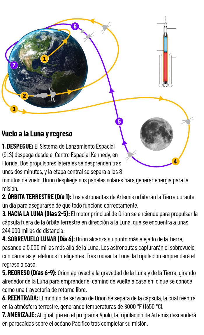 1. DESPEGUE: El Sistema de Lanzamiento Espacial (SLS) despega desde el Centro Espacial Kennedy, en Florida. Dos propulsores laterales se desprenden tras unos dos minutos, y la etapa central se separa a los 8 minutos de vuelo. Orion despliega sus paneles solares para generar energía para la misión.